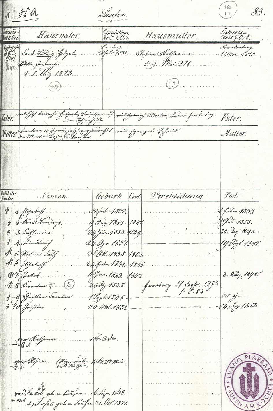 50 Carl Ludwig Hägele * 10.6.1801 74429 Öchsenhöfle + 2.8.1872 74429 Laufen a.K